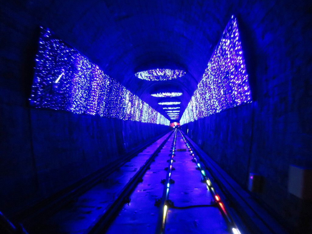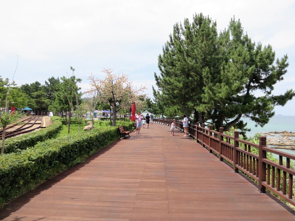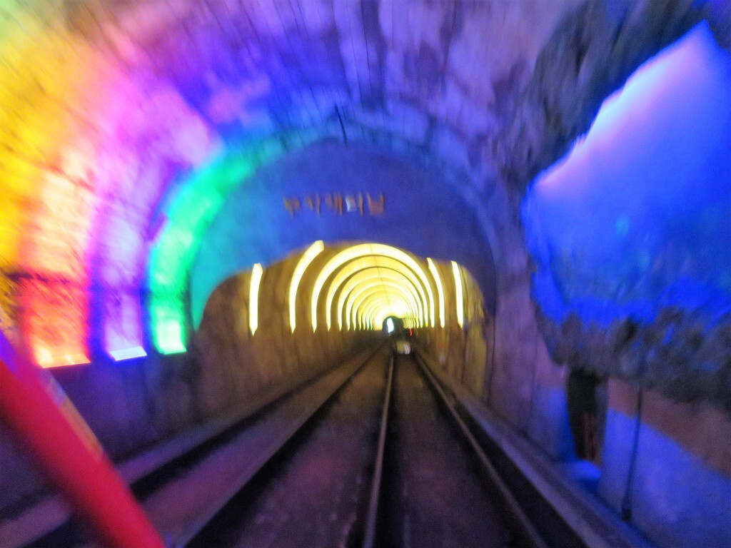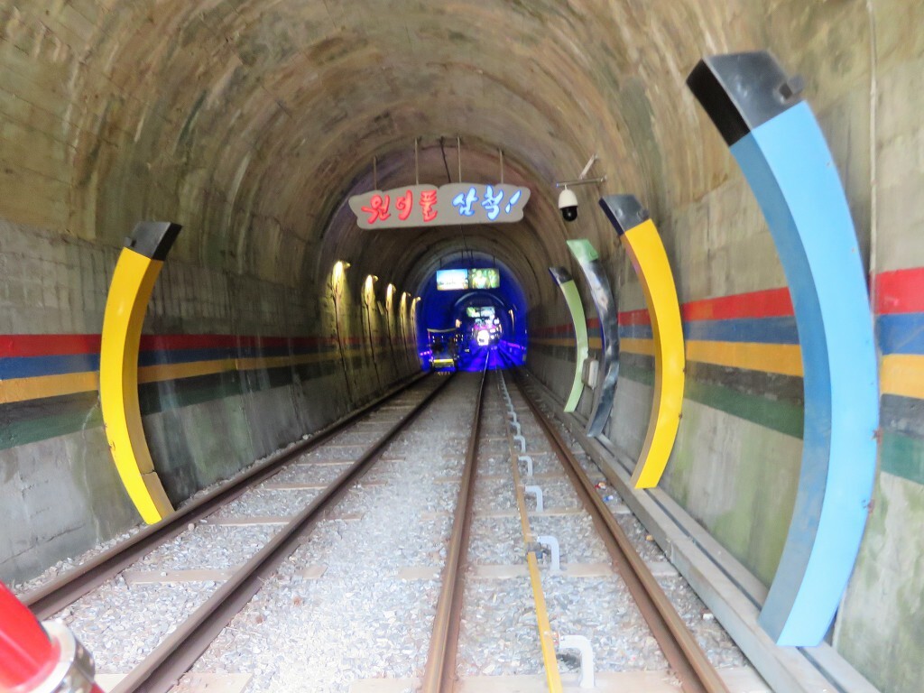 궁촌역에서 탑승했습니다. 울창한 소나무숲을 거닐며 바다가 보이는 초곡쉼터전망대와 디오라마, 루비나리로 이어지는 터널에서 다양한 조형물을 감상하며 추억을 되새길 수 있다., 수중 세계와 은하계의 신비한 세계는 발광 다이오드와 같은 이상한 빛의 쇼로 놀라움을 금치 못합니다..