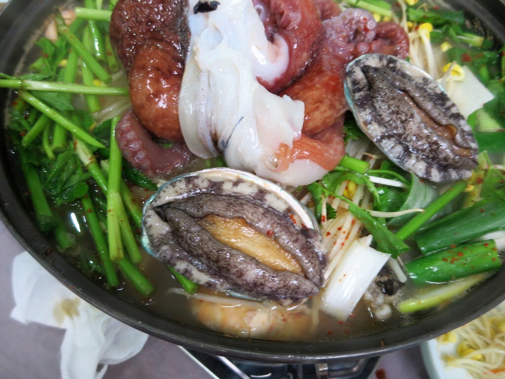 드디어 식당에 갔습니다. 식당 주인의 아버지는 낚싯배를 운영하며 직접 잡은 해산물로 요리를 한다.. 갓 잡은 문어와 생선, 껍질이 가득. 이 식당이 맞습니까?.