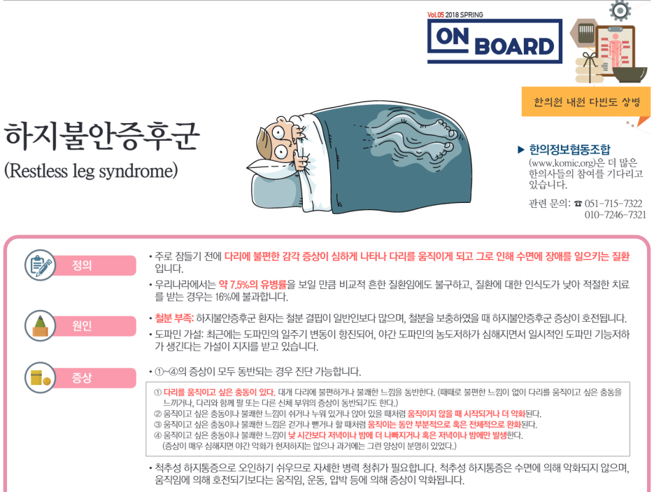 하지불안증후군은 잠들기 전 다리에 심한 불편감을 느껴 다리를 움직이게 하여 수면장애를 유발할 수 있는 질환입니다. 증상이 모호하기 때문에 많은 사람들이 질병이라고 생각하지 않기 때문에 실제로 치료를 받는 경우는 많지 않습니다. 이 외에도 다른 질병으로 의사를 찾아가는 과정에서 진단을 받는 경우도 있다. 국내 유병률은 약 7.5%로 비교적 흔한 질환이지만, 질병에 대한 인식 부족으로 제대로 치료를 받는 경우는 16%에 불과하다.