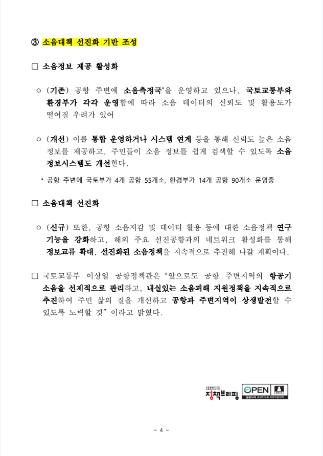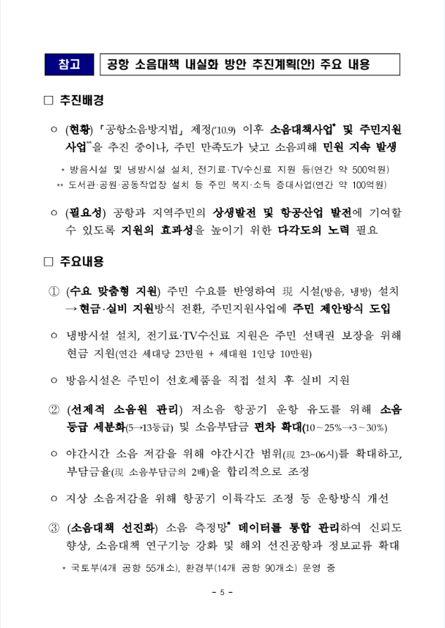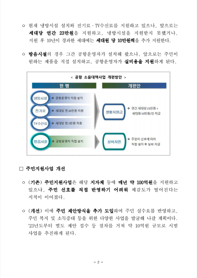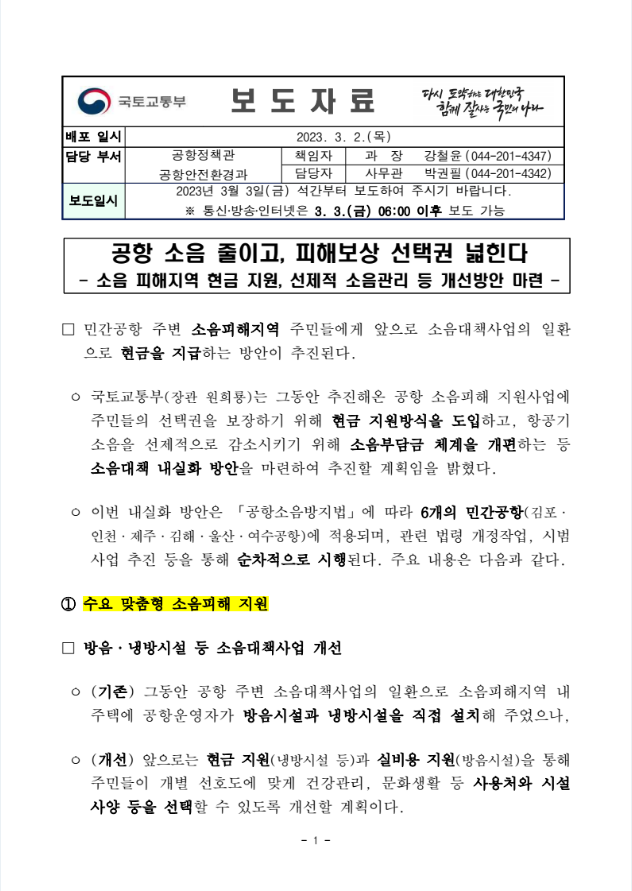 – 1 – 보도자료 게재 일시 2023. 3. 2.(목) 소속부서 공항정책관 공항안전환경과장 강철윤 (044-201-4347) 담당관 박권필 ( 044-201-4342) 보도일시 2023년 3월 3일(금) 석간신문부터 제보 부탁드립니다. ※ 통신, 방송, 인터넷은 3월 3일(금) 06:00부터 제보 가능 보상기회 확대 – 민간공항 등 개선방안 마련 소음저감사업의 일환으로 지역주민 현금지불제를 추진하고 있습니다. ㅇ 국토교통부(장관 원희룡)는 기존에 자금을 지원받은 공항소음피해지원사업에 지역주민의 투표권 보장을 위한 현금지원절차를 도입하고, 항공기 소음을 선제적으로 저감할 수 있도록 소음세 제도를 개편하였다. 방안을 마련해 시행한다고 밝혔다. ㅇ 본 내재화 방안은 「공항소음방지법」에 따른 민간공항 6개소(김포공항, 인천공항, 제주공항, 김해공항, 울산공항, 여수공항)에 적용되며, 관계법령을 개정하여 순차적으로 시행할 예정이다. 파일럿 프로젝트를 추진하고 있습니다. 주요 내용은 다음과 같습니다. ① 소음피해 시급한 지원 □ 방음, 냉난방 등 소음대책 개선 ㅇ (기존) 공항주변 소음대책사업의 일환으로 공항운영자가 소음피해지역의 주택에 방음·공조를 직접 설치, 다만 ㅇ (개선) 금전적 지원(냉장시설 등) 및 실비지원 등을 통해 주민 개개인의 기호에 따라 의료, 문화생활 등 시설 및 용도 선택이 가능하도록 향후 개선 예정 (방음시설). – 2 – ㅇ 현재는 에어컨 설치비, 전기세, TV비를 지원하고 있으나, 앞으로는 가구당 연간 23만원을 지원하고, 에어컨이 있는 가구에 가구원 10만원을 추가하여, ㅇ 방음시설의 경우 지금까지는 공항운영자가 설치하였으나, 앞으로는 지역주민이 원하는 제품을 직접 설치하고 공항운영자가 지원 실제 비용. □ 주민지원사업 개선 ㅇ (기존) 주민지원사업은 지자체 등에 연간 약 100억 원 지원 ㅇ (개선) 이와 관련, 주민 제안 방법을 모색하고 주민 웰빙과 소득 창출을 위한 다양한 사업을 발굴합니다. 2023년부터 약 10억원 규모의 시범사업이 개별 모집 등 절차를 거쳐 자금을 조달한다. – 3 – ② 예방적 항공기 소음방지 □ 항공기 소음부담금 개편 ㅇ (기존) 운항 항공기 소음부담금은 소음도에 따라 5단계로 구분하여 항공기 착륙료의 10~25%(약 . 84%)가 4급과 5급에 배정되어 등급에 따른 차별이 미흡하다. ㅇ (개선) 이에 따라 소음도를 13단계로 구분하고, 착륙료의 3~30%까지 격차를 벌려 소음기 부담금도 인상하고, 저소음 항공기는 항공사는 저소음 항공기의 조기 도입을 장려합니다. □ 야간운행 개선 및 소음저감 운용방식 ㅇ (기존) 현재 야간(06/23) 운항하는 항공기에 대해 이중소음세가 부과되나 ㅇ (개선) 19시 범위 내에서 합리적으로 시간조정 예정 00시부터 07시까지 「소음·진동규제법」에 의거 야간운항 제한 및 공항주변 생활환경 개선 ㅇ 야간소음부과금 추가수입은 부과 대상 공항 주변에서 활용하는 방안도 검토 중이다. ㅇ 공항환경의 특성(지형, 도시화 등)을 고려하여 소음저감 운영방식도 개선할 예정이다. B. 이륙 각도 조정 및 활주로 운영 개선 연구 서비스에 의해 생성됩니다. – 4 – ③ 선진 소음대책 기반 구축 □ 소음정보 제공 활성화 ㅇ (기존) 공항주변 소음측정소* 운영 환경사업 별도 ㅇ (개선) 통합운영 또는 시스템 연계를 통해 신뢰할 수 있는 소음정보를 제공하고, 주민이 쉽게 소음정보를 검색할 수 있도록 소음정보시스템을 개선한다. *공항을 중심으로 국토교통부는 4개 공항 55개 공항, 환경부는 14개 공항 90개 공항을 운영하고 있으며, 앞으로도 선진 소음대책을 지속적으로 추진하고, 공항. □ 이상일 국토교통부 공항정책관은 “공항주변 항공기소음을 지속적으로 예방하고, 지역주민의 삶의 질 향상을 위한 대대적인 소음피해 지원대책을 지속적으로 추진하겠다”고 말했다. 주민.”, 공항과 주변 지역의 공존을 도모합니다. 노력하겠다”고 말했다. – 5 – 비고 공항소음대책 내재화 추진계획(안) 주요내용 □ 추진경위 ㅇ (현황) 「공항소음관리법」 시행(‘10.9) 이후 소음대책사업* 및 주민지원사업**은 추진되었으나, 소음피해 주민만족도 낮아 민사소송 지속* 방음·공조 설치, 전기·텔레비전 지원 등 (연간 약 500억 원) ** 복리후생 및 소득 도서관, 공원, 공유업무공간 조성 등 사업확대(연간 약 100억 원) ㅇ (필요) 공항과 지역주민의 공동발전에 기여할 수 있도록 지원 실효성 제고를 위한 다양한 노력 필요 , 항공산업 발전 주요내용 ① (맞춤형 지원 ) 기존시설(SCHA ll 단열, 공조) 주민 니즈 반영 설치 → 현금/실비지원 방식으로 전환, 주민지원사업 주민제안방식 도입 주민투표권(세대당 연간 23만원 + 세대원 10만원) ㅇ 방음시설 ㅇ 주민이 직접 선호제품 설치 후 실비 지원 ② (소음원 예방관리) 소음도 구분(5→13단계) 저소음 항공기 운항을 위한 소음 출력 편차 확대(10~25% → 3~30%) ㅇ 야간 소음 감소를 위해 야간 시간대 확대(23~06:00) 및 요금 합리적 조정 요율(기존 소음수수료 2배) ㅇ비행 개선 충족 예를 들어 나. 지상 소음 감소를 위한 항공기 이륙각도 조정 ③ (소음대책 추진) 신뢰성 향상을 위한 소음측정망* 데이터 통합관리, 소음대책 연구역량 강화, 해외 선진공항