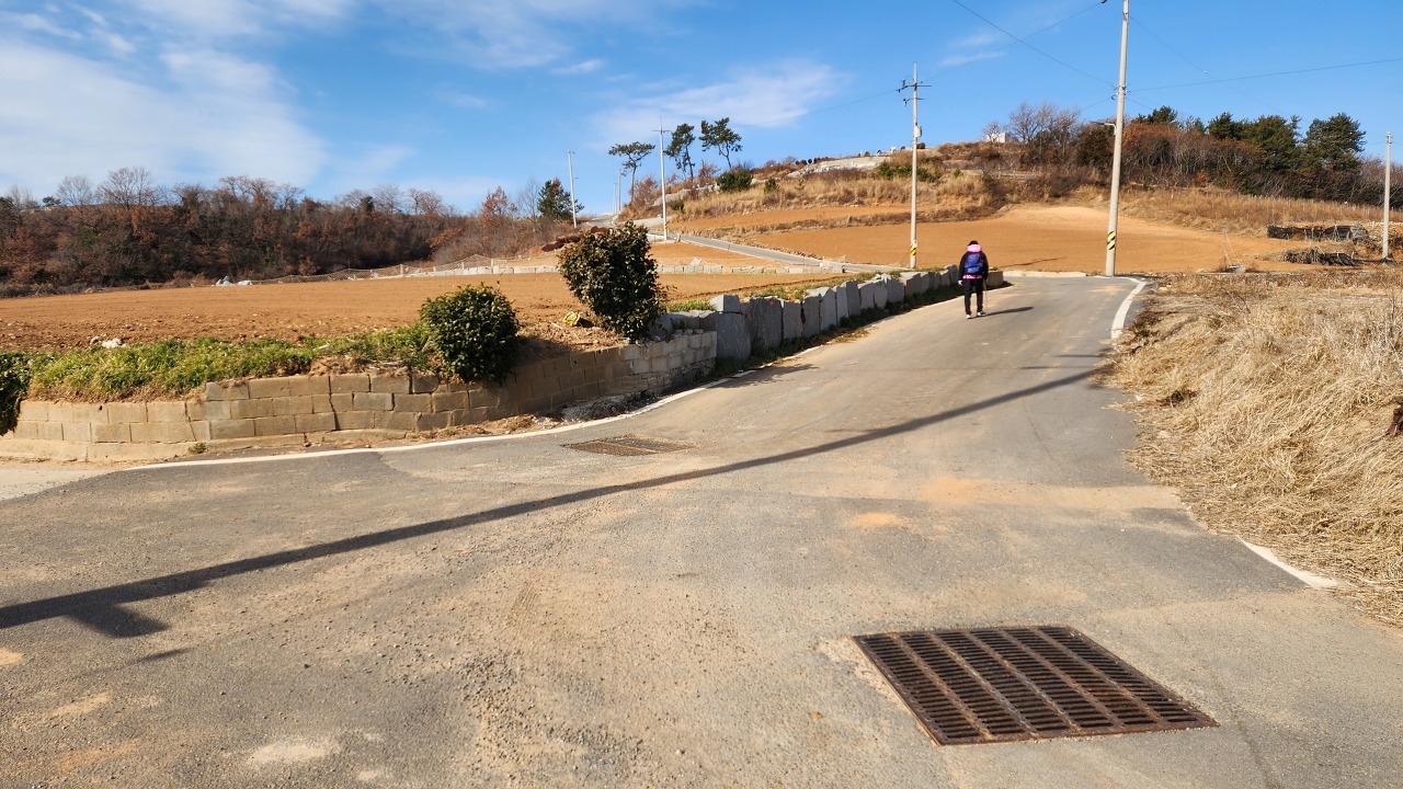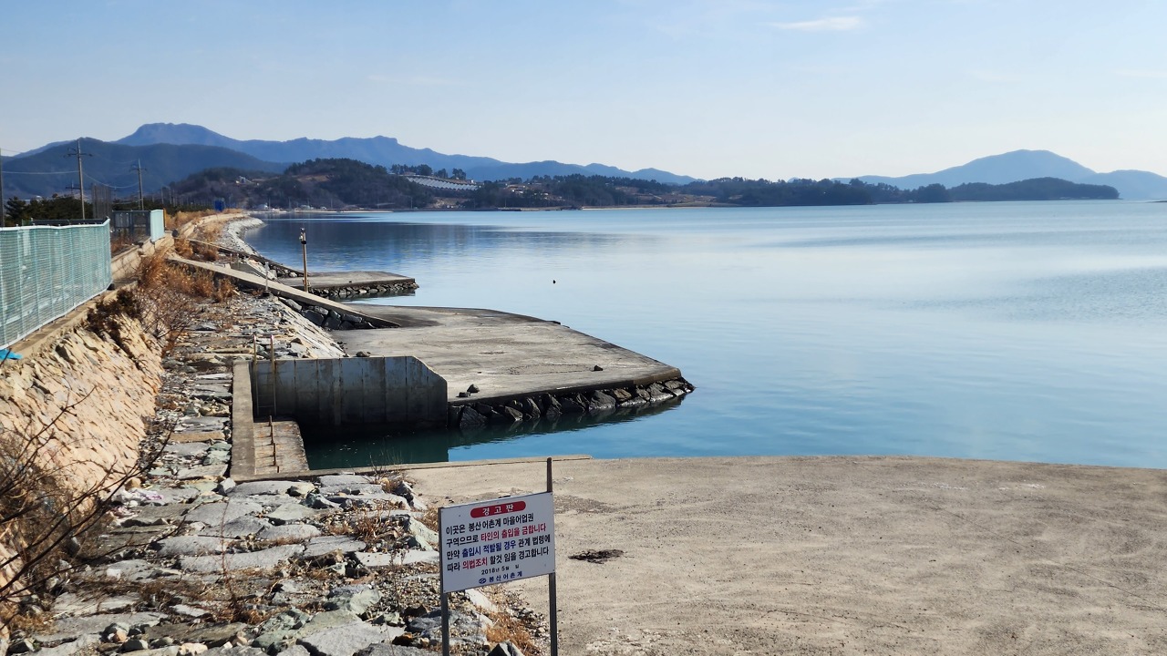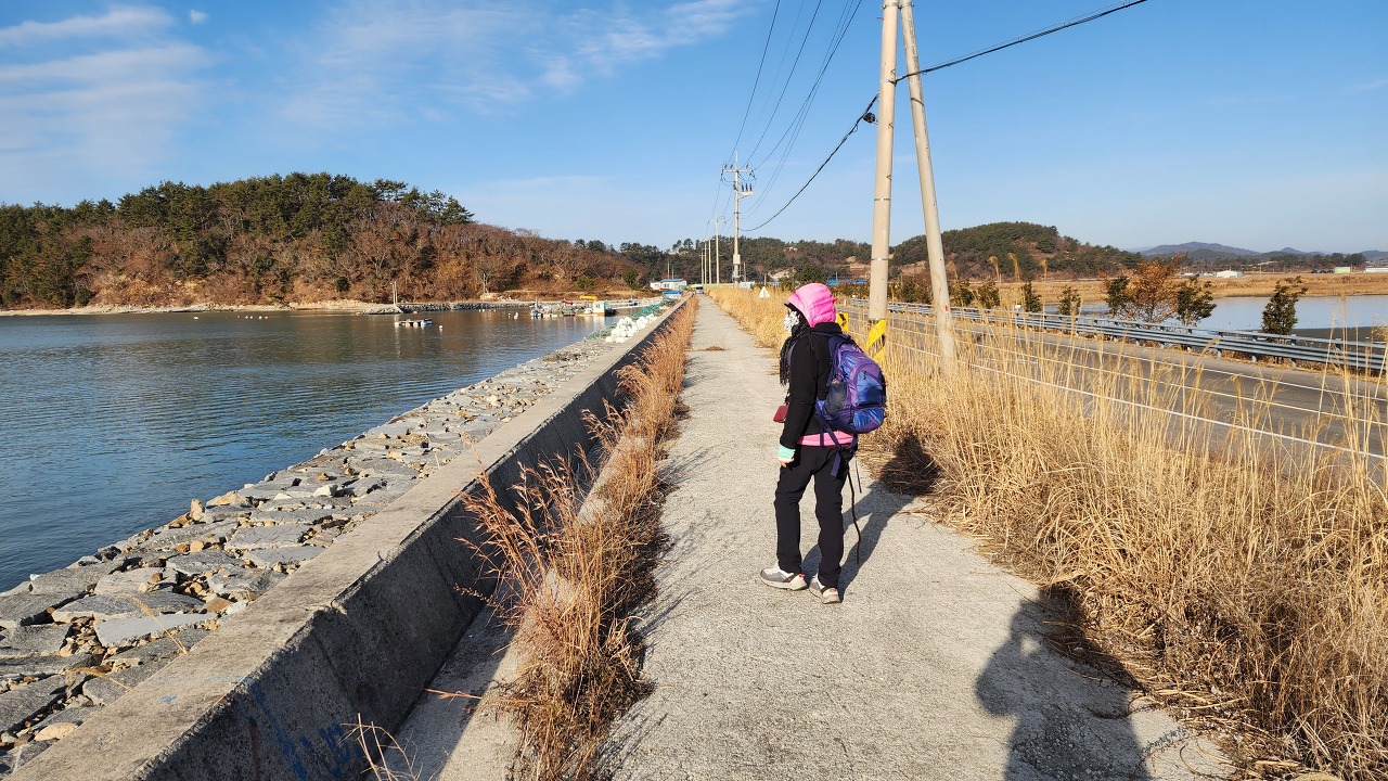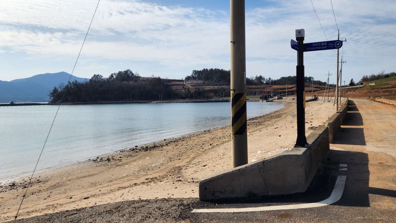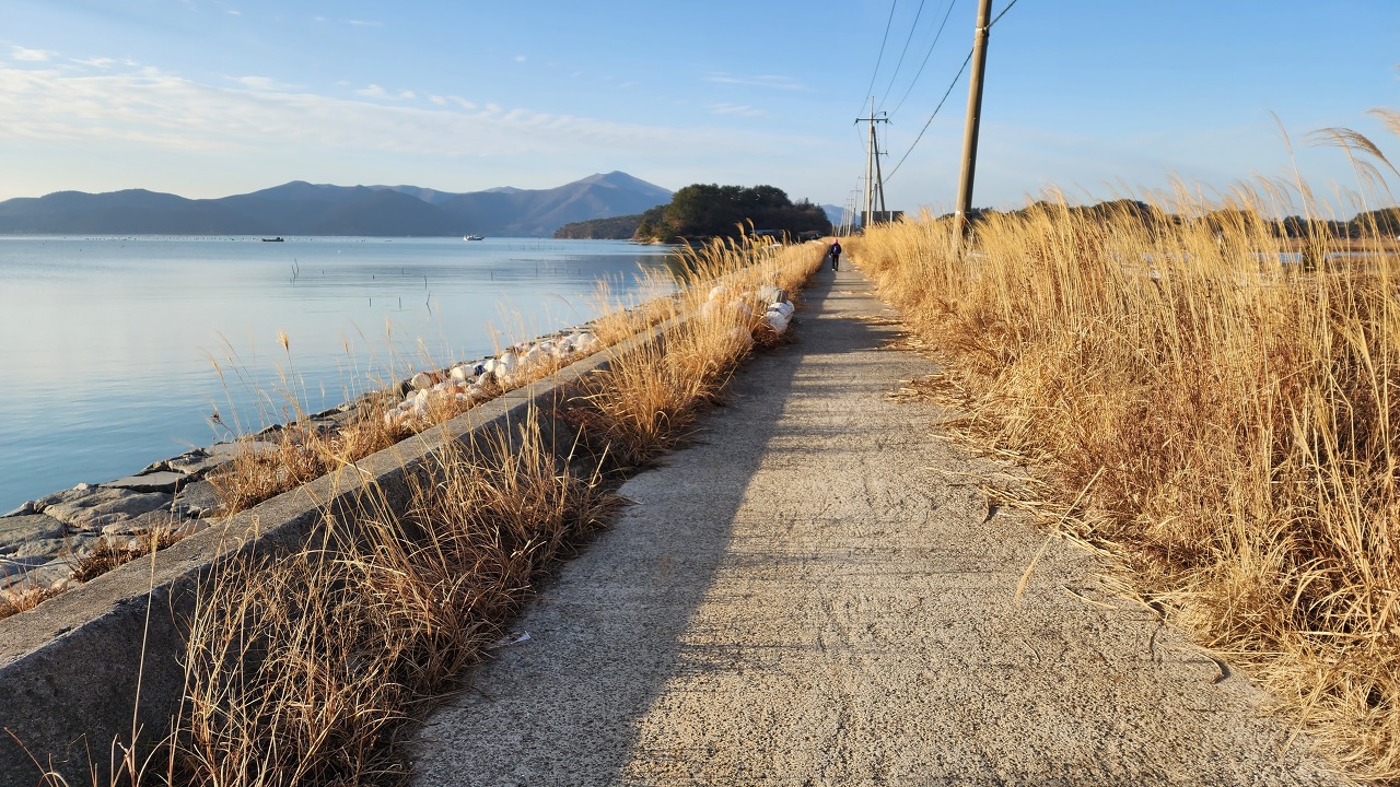 오전 11시 42분 방파제 앞 삼거리 횡단보도 직진 후 시멘트 포장된 방파제를 건너세요.
