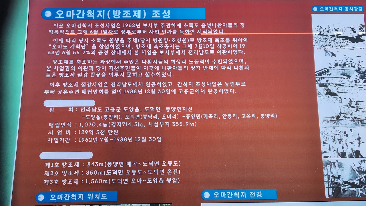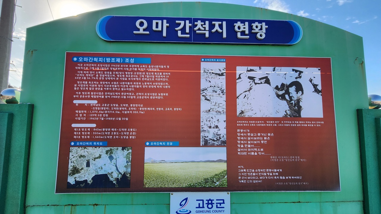 10; 00/17. 할머니 삼방관. 오마 지역 해양 체험 센터 오른쪽은 오마 간척 한센 기념 공원 오마 간척지 현황판