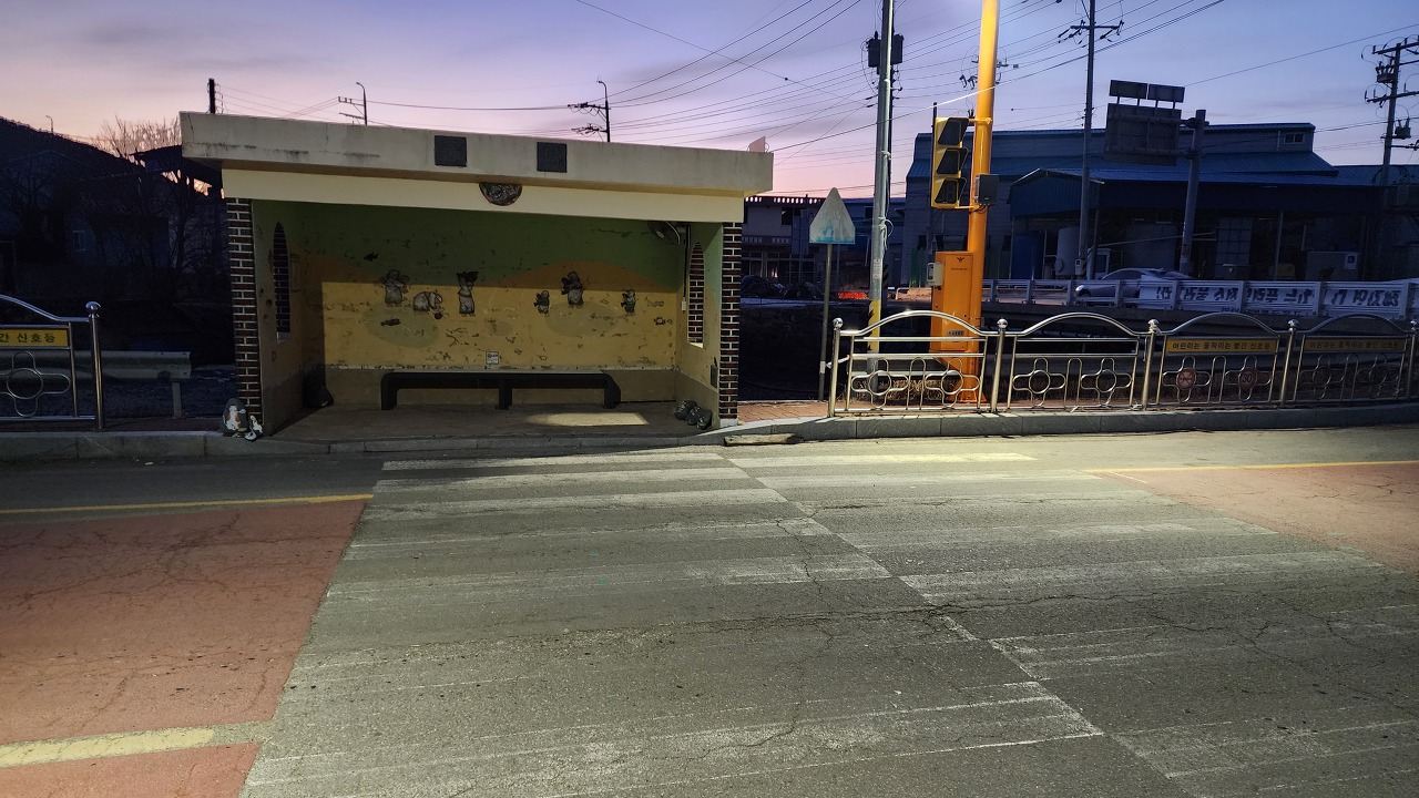 09:37. 은전마을회관, 버스정류장, 은전부두, 소록교가 가까이 보인다.
