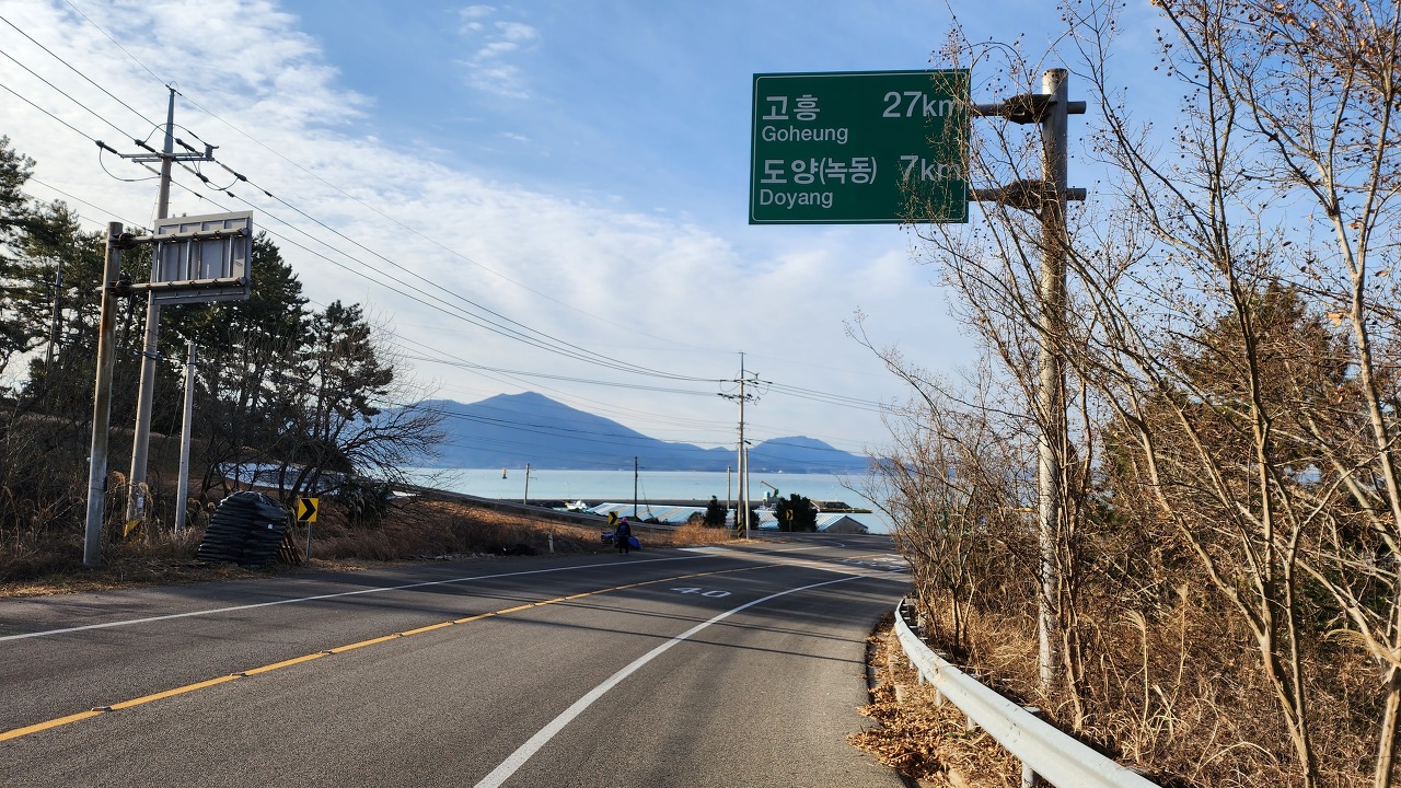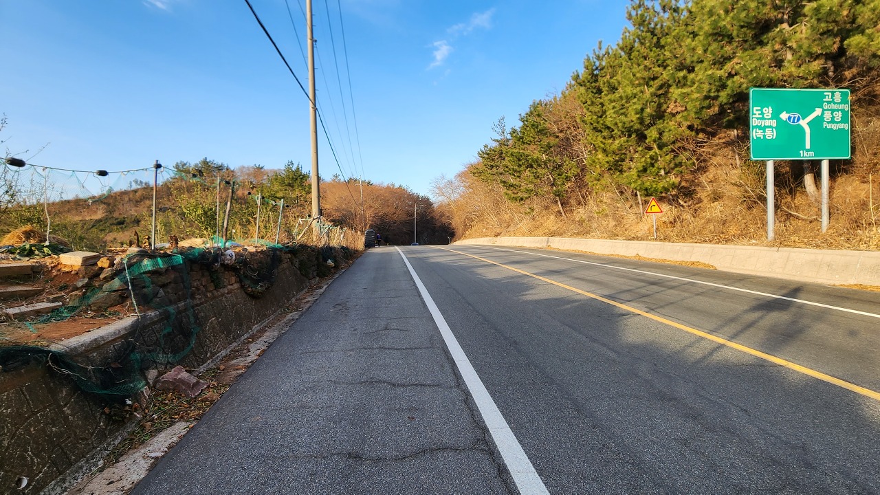 08:24 패스를 넘어 운전하십시오. 1km 더 가면 왼쪽이 도양(녹동)이고 오른쪽이 고흥과 풍양 표지판이다.