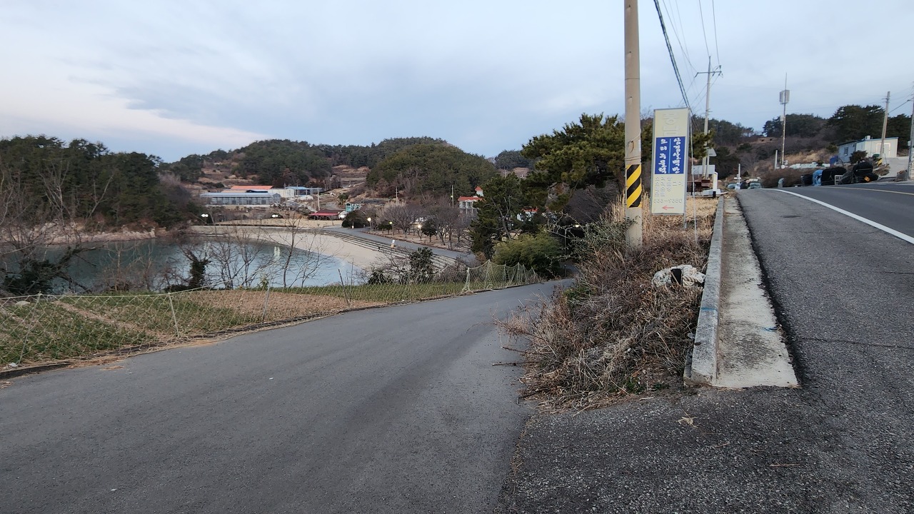 오전 11시 42분 방파제 앞 삼거리 횡단보도 직진 후 시멘트 포장된 방파제를 건너세요.