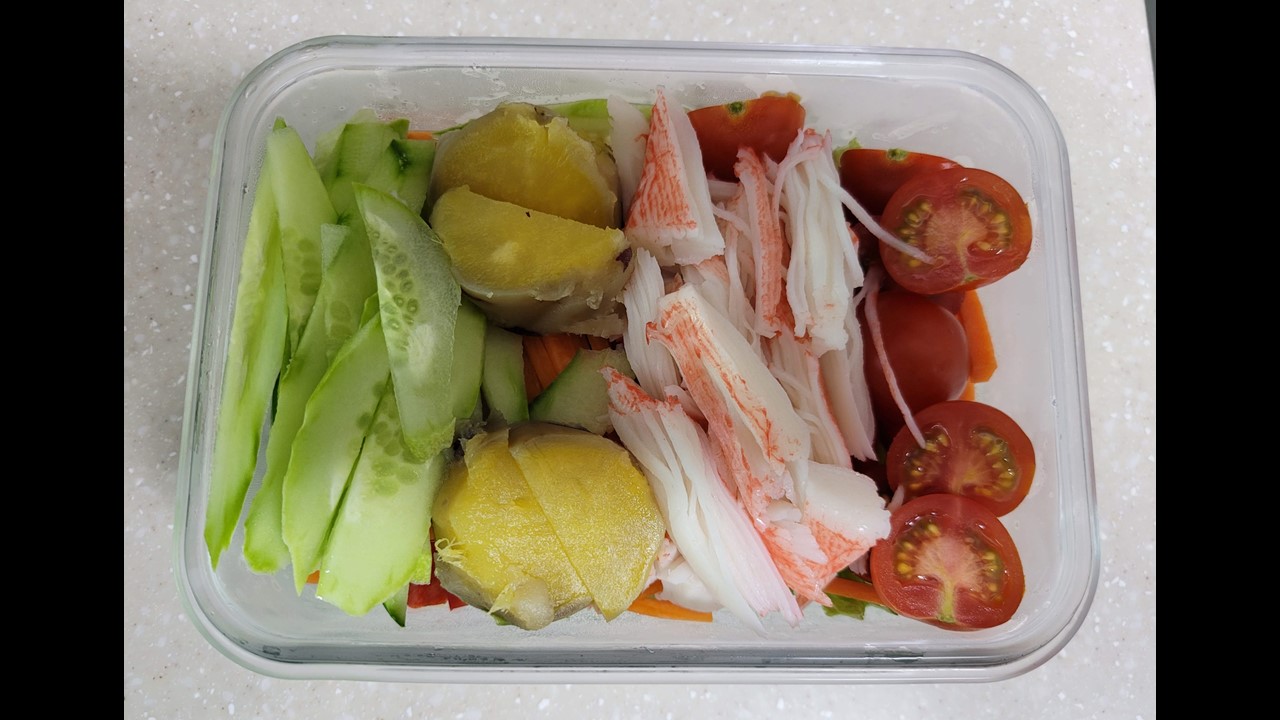 어느 날 아침 일어나 거실로 걸어가 보니 식탁 위에 도시락이 놓여 있었다. 조심스럽게 뚜껑을 열자 싱싱한 야채 등 다양한 재료들이 즐겁게 흔들렸다. 오이, 당근, 찐 참마, 방울토마토, 게살까지 내가 좋아하는 재료들. 방울토마토는 한입에 먹을 수 있고, 오이는 굵게 손질하되 잘게 썰면 쉽게 먹을 수 있다.