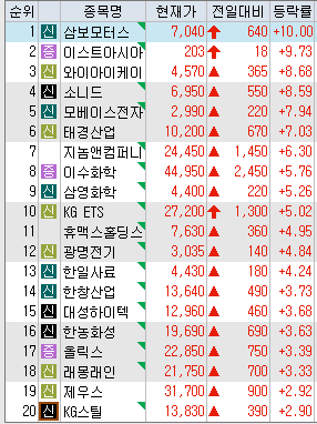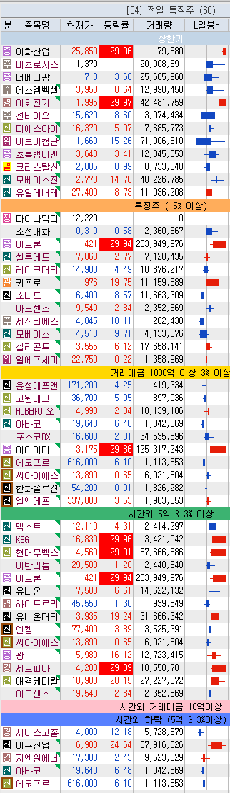 오늘의 시간 외 특집 주간5억원 이상 3% 상승한 종목 삼보모터스(10.00%), 동아시아(9.73%), YIK (8.68%), 소니드(8.59%), 모베이스전자(7.94%), 태경산업(7.03%), 게놈앤컴퍼니(6.30%), 이수화학(5.76%), 사명학(5.26%), KT ETS(5.02%), 휴맥스홀딩스(4.95%), 광명전기(4.84%), 한일사료(4.24%), 한창산업(3.73%), 대성하이텍(3.68%), 한농화학(3.63%), 올릭스(3.39%), 래몽레인(3.33%) %) 안돼.