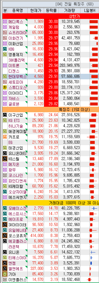 주가 15% 이상 증가 오늘의 기능 참고예를 들면 이구산업, KG ETS, 하나기술, 애경화학, 카프로, EG, 태경산업, 유니온머티리얼, KG스틸, 메지온, 광무, 코스나인, 화인디앤씨, KG케미칼, 오상재L, S CNG 등이 있다.