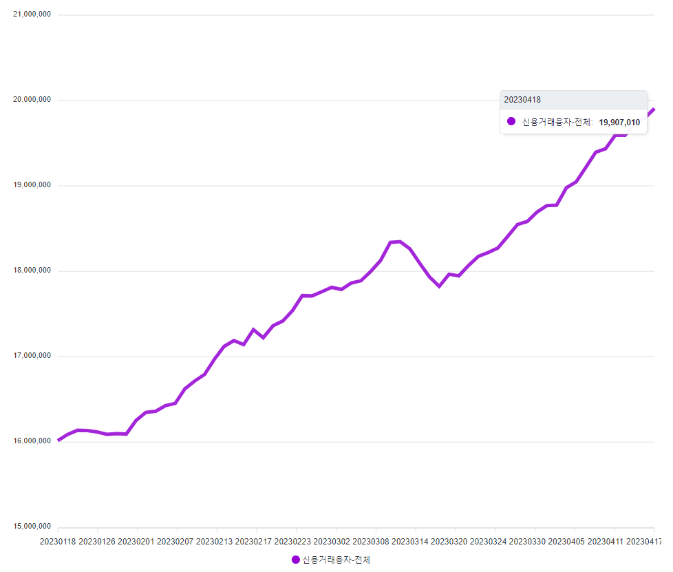 오늘의 크레딧 잔액1129억이 줄어든 19조9100억으로 집계됐다.