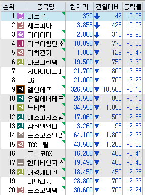 오늘 시간 외 약세 이트론(-9.98%), 세토피아 (-9.93%), ID(-9.92%)전기차 첨단소재(-6.60%), 이화전기(-6.47%), 아모그린텍(-3.70%), 지아이이노베이션(-3.56%), 이지(-3.23%), 엘앤에프(-3.12%), 율에너텍(-3.10%) 안돼.