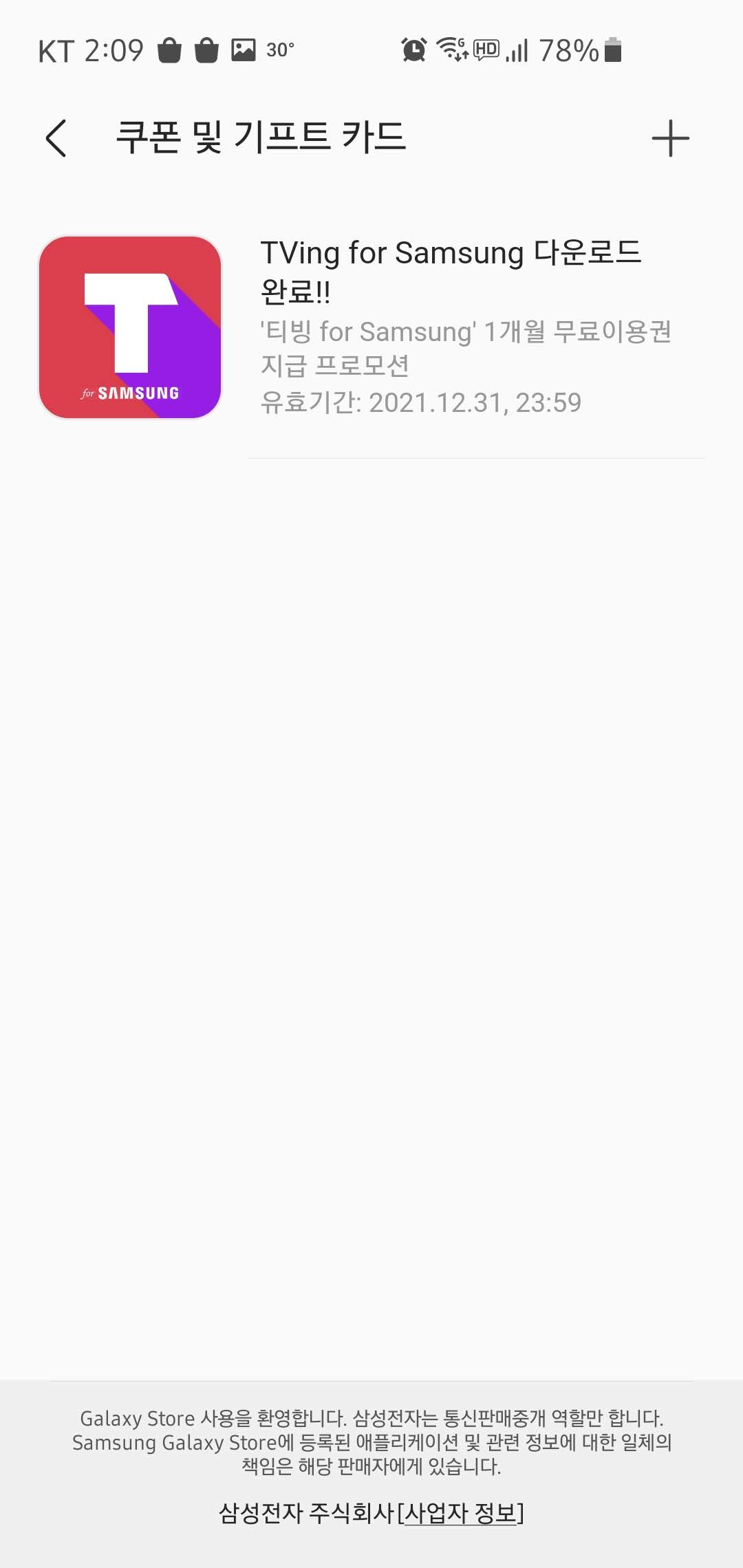 이전에는 갤럭시 스토어에서 티빙 앱을 다운로드할 수 있는 1개월 이용권을 제공하는 프로모션이 있었지만 현재 진행 중이 아닙니다.