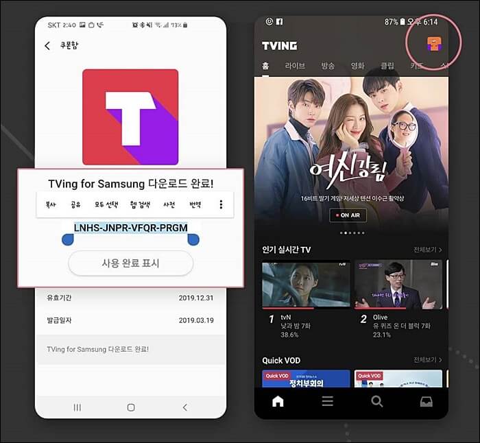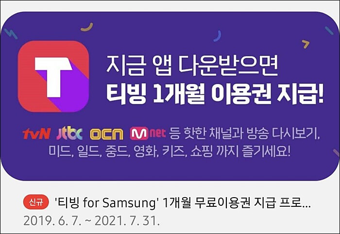이전에는 갤럭시 스토어에서 티빙 앱을 다운로드할 수 있는 1개월 이용권을 제공하는 프로모션이 있었지만 현재 진행 중이 아닙니다.