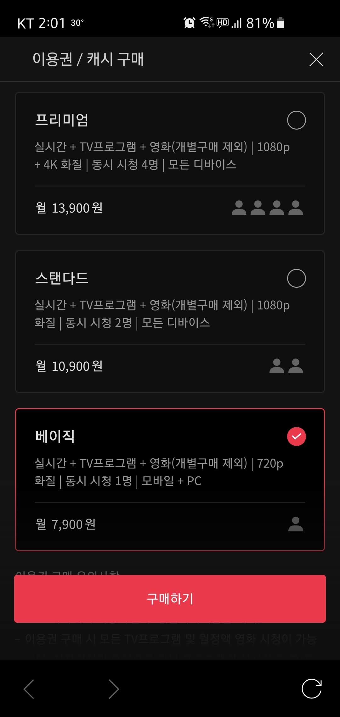 실시간 시청 + TV가이드 + T ONLY 콘텐츠 | 라이브 + TV 프로그램 + 영화(개별 구매 제외) | ||
