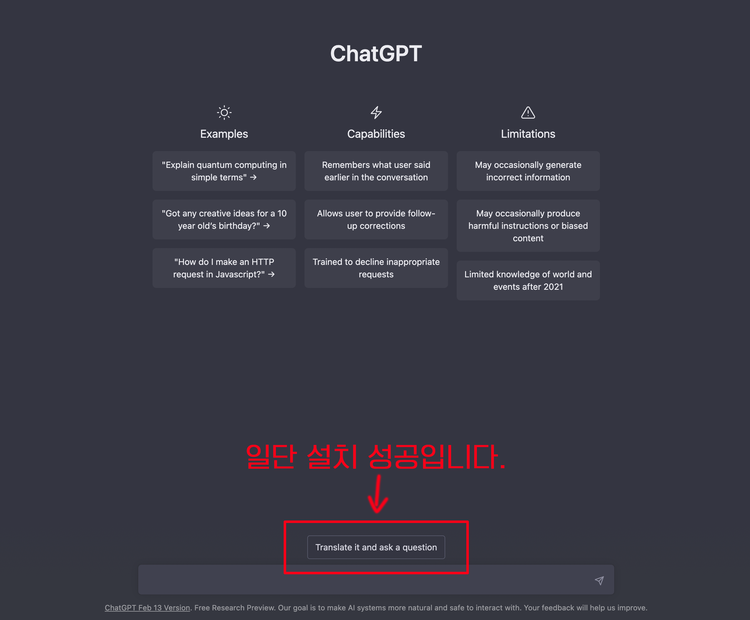 2-5 그러면 아래 화면과 같이 번역하고 질문하기라는 이름의 창이 나타나면 성공적으로 설치가 완료된 것입니다.