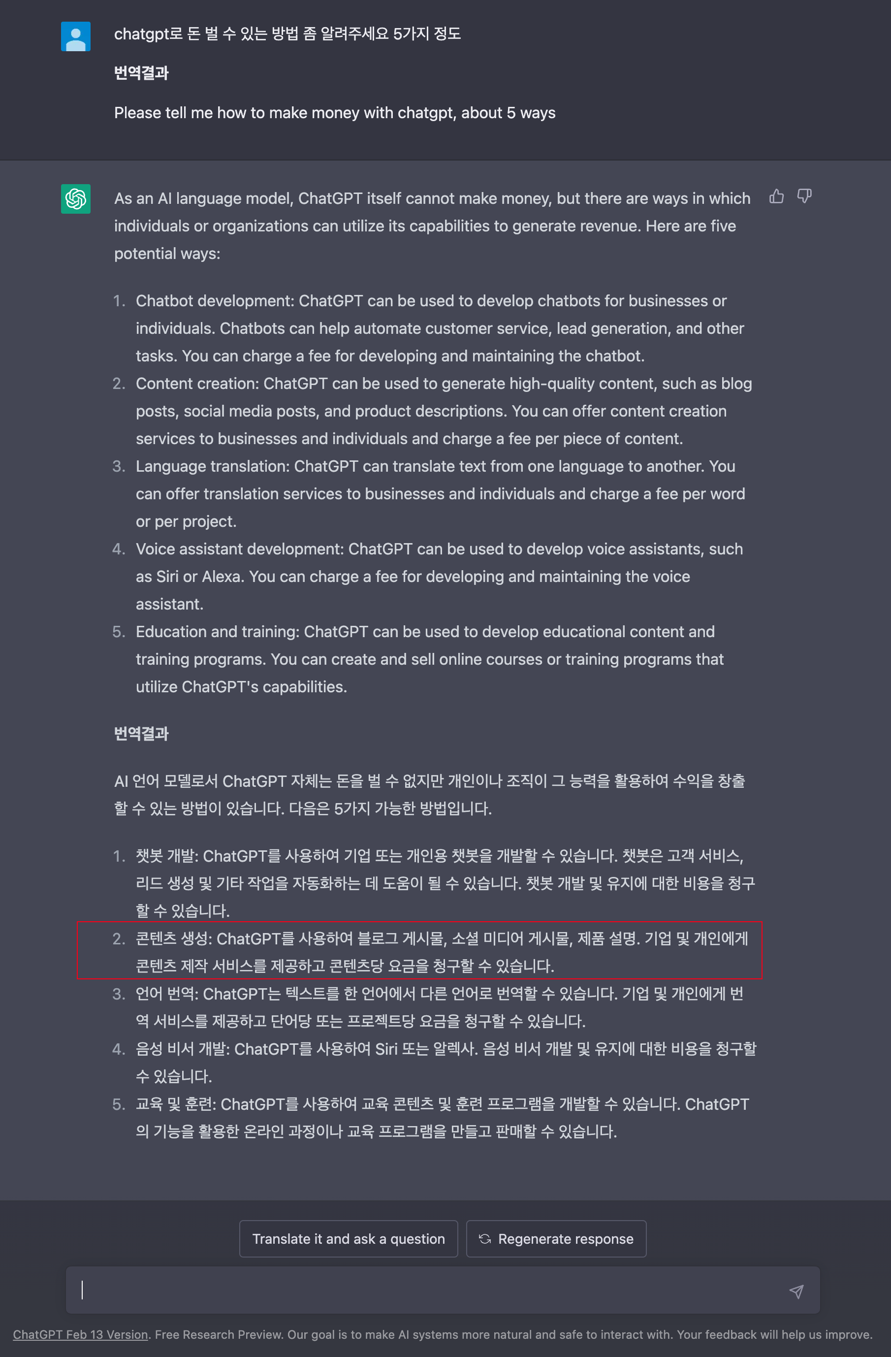 ChatGPT는 질문을 영어로, 답을 한국어로 번역해주는 번역기입니다.