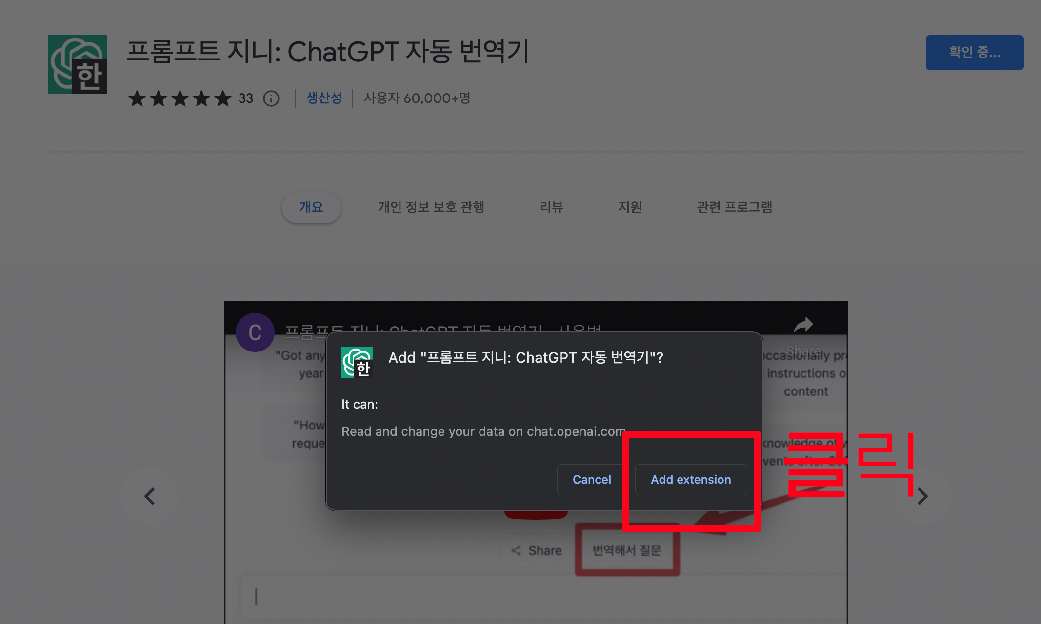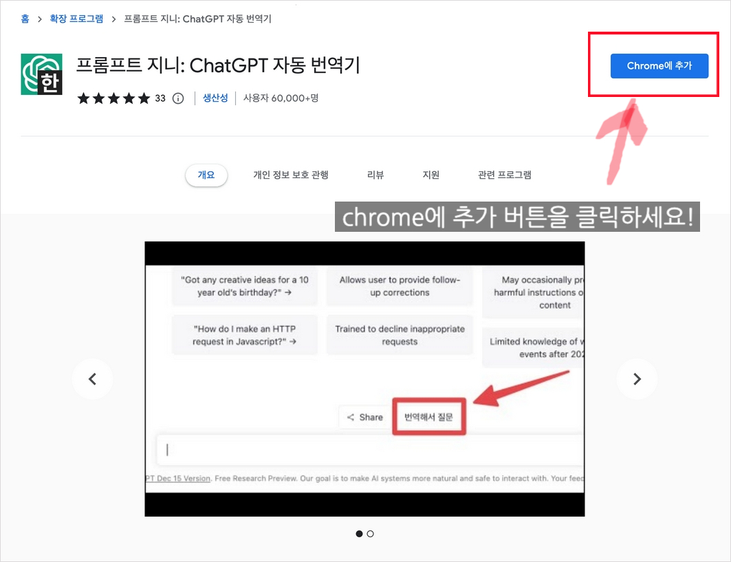 2-2 Prompt Genie를 설치하려면 아래 이미지에서 파란색 Chrome에 추가 버튼을 클릭합니다.