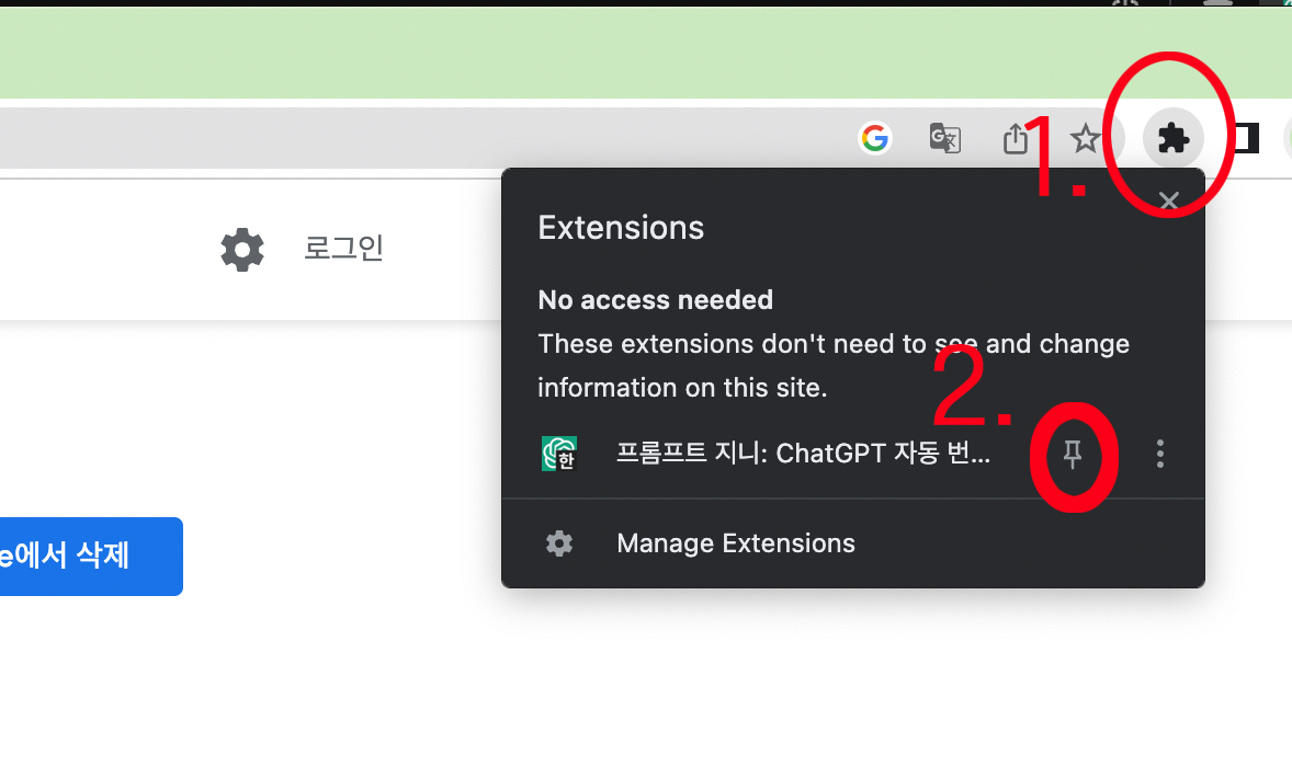 1-5 앞서 언급한 바와 같이 ChatGpt는 영어에 최적화되어 있기 때문에 먼저 한국어로 명령어를 입력하면 영어로 번역해주는 플러그인을 설치해야 합니다. 이 플러그인은 Chrome 확장 프로그램입니다. 가능한 한 빨리 설치해야 하는 첫 번째 Chrome 확장 프로그램은 Prompt Genie입니다.