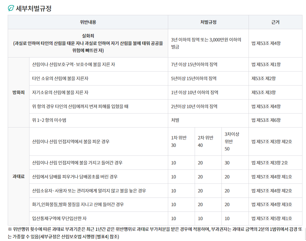 삼림 파괴는 대기 중 이산화탄소의 양을 증가시킵니다. 아마 지금은 방화 범죄에 대해 최고형을 선고할 수 있는 법을 제정할 것입니다. 방화로 인한 삼림 파괴는 전 세계적인 피해와도 같으며, 탄소에 민감한 사회에서는 절대 용납할 수 없기 때문입니다. 아래 표는 방화범 처벌 규정인 산림청에서 확인할 수 있다. 저자는 방화범에 대한 처벌 규정을 더욱 강화해야 한다고 강력히 주장한다.